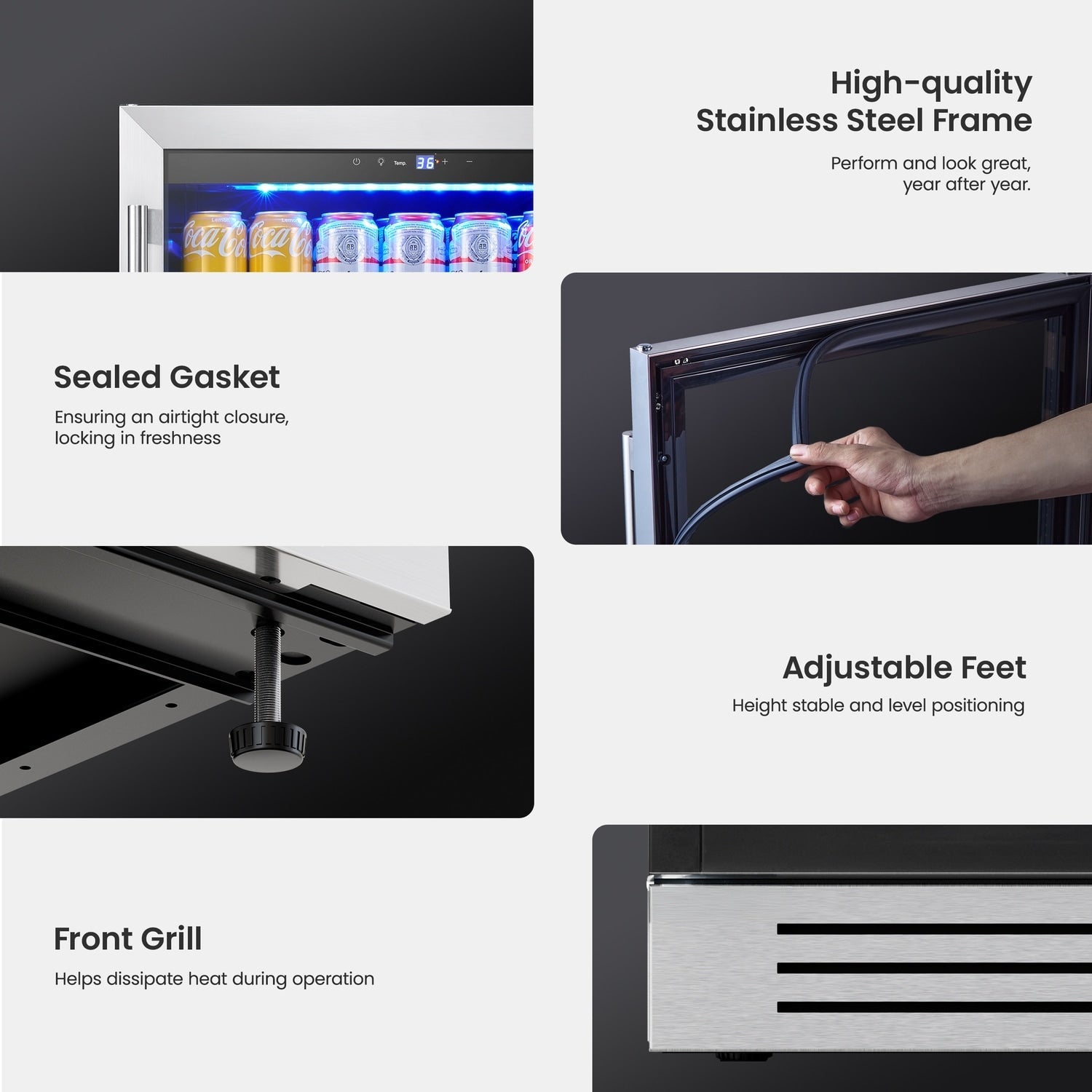 • Design élégant et sécurisé : Ce réfrigérateur à boissons est doté d'une élégante porte en acier inoxydable avec poignée en L et double vitrage résistant aux UV. Son esthétique moderne s'intègre parfaitement à tous les styles de décoration.