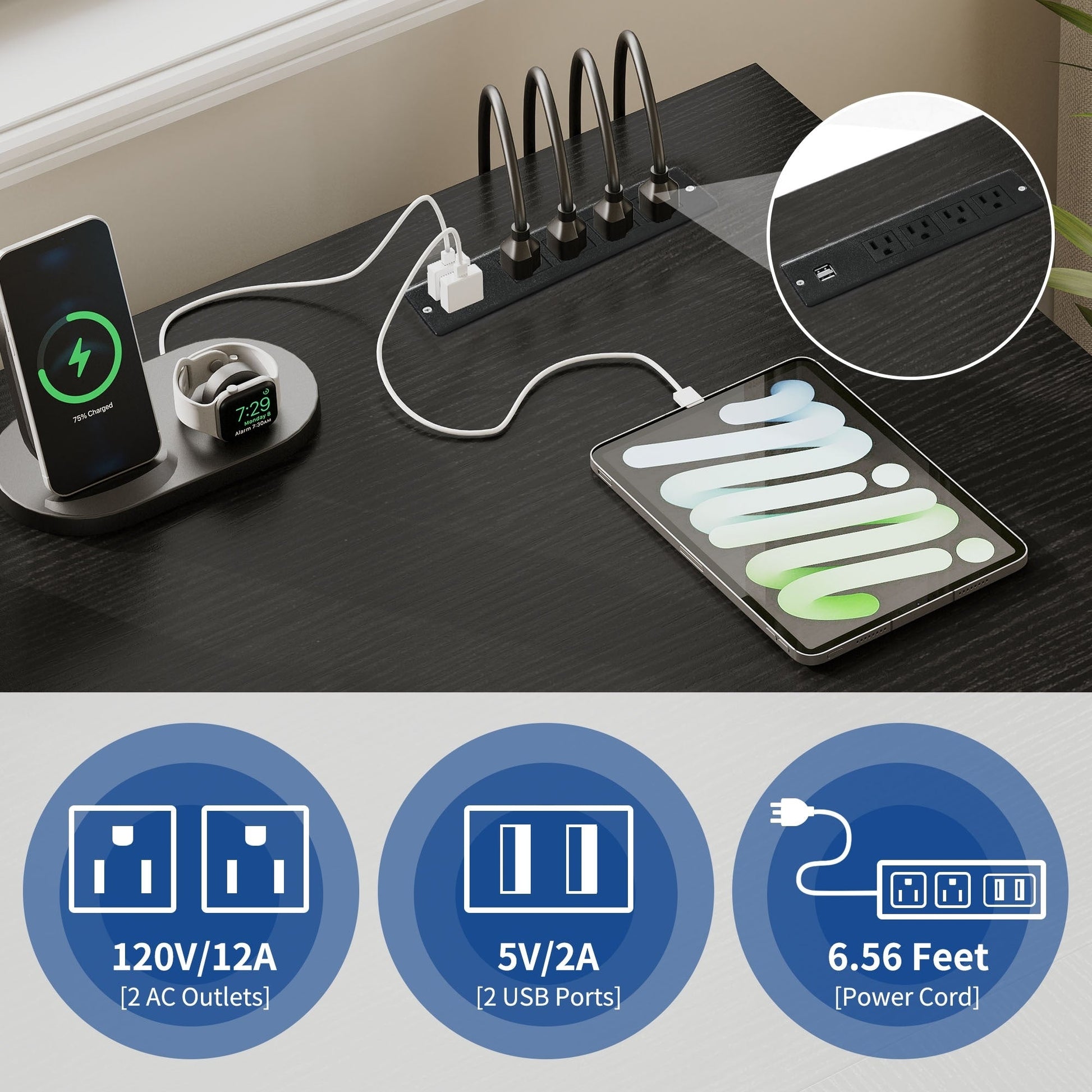1. Rechargez vos appareils en toute simplicité grâce à ce bureau en L avec tiroirs. Il est équipé de 2 ports USB, de 4 prises de courant et d'un cordon d'alimentation de 2 m pour que votre ordinateur, ordinateur portable, téléphone, tablette, imprimante et console de jeu restent branchés et prêts à l'emploi.