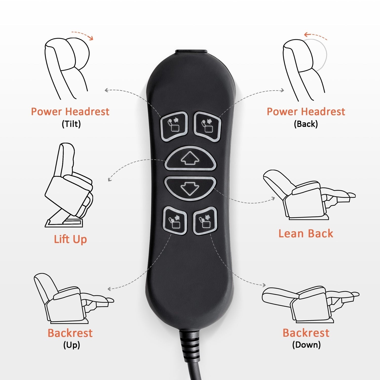 • Appuie-tête électrique : Bien que les appuis-tête réglables puissent être utilisés pour un confort personnalisé en position assise droite, ils sont spécialement conçus pour permettre à une personne inclinée en arrière de regarder vers l'avant, par exemple vers la télévision, sans forcer la tête ou le cou