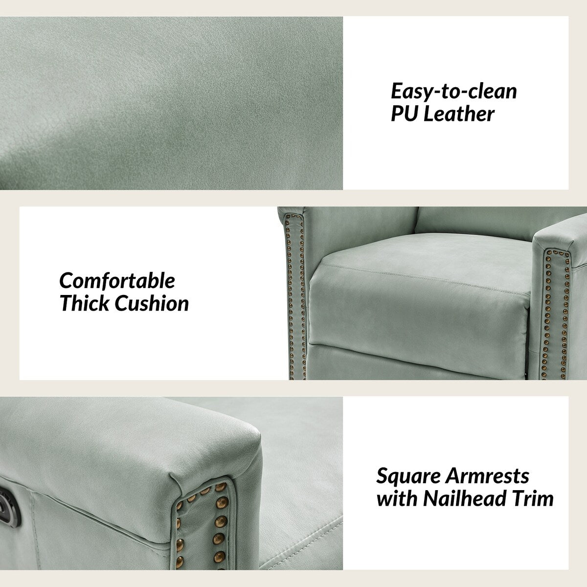 Garniture de clous en cuivre : ornant les bords du cadre de l'ensemble de fauteuils inclinables, la garniture de clous en cuivre ajoute une touche de sophistication et de raffinement, accentuant le charme traditionnel de l'ensemble de fauteuils inclinables et conférant une esthétique luxueuse à la conception globale.